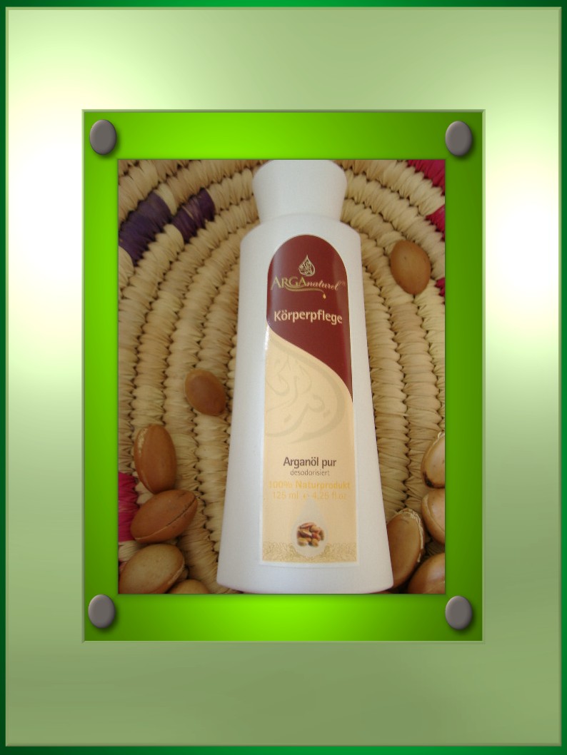|  „Reines Öl aus Argan-Früchten pflegt die Haut und hilft bei Neurodermitis und Akne. Als Speiseöl wirkt es positiv auf den Cholesterinspiegel. Das Öl der Früchte des marokkanischen Argan-Baumes zählt zu den kostbarsten Lebensmitteln der Welt Stärkung des Immunsystems, Linderung bei Neurodermitis, Schutz vor Herzinfarkt und Alzheimer Reich an ungesättigten Fettsäuren, Vitaminen und natürlichen Antioxidanzien und cholesterinsenkend.“ (Dr. Schleicher , Peter)